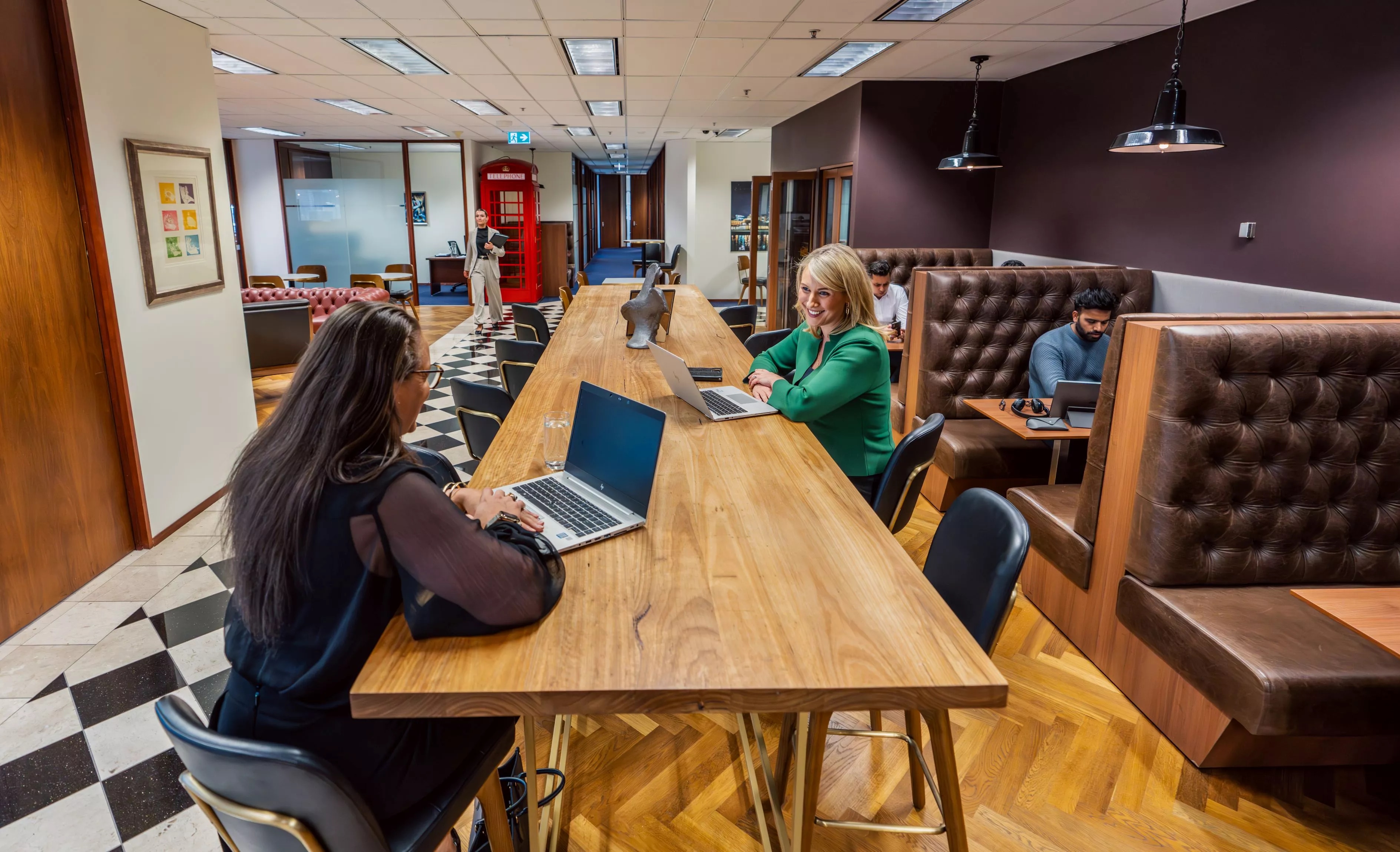• People are working in a Servcorp coworking space, featuring high-back booth seating, a stylish interior, and a red phone booth in the hallway.